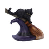 A playful black kitty climbs atop a small broom which is supported by a purple witches hat. Cast in the finest resin before being expertly hand-painted, this feline figurine is the perfect addition to any alternative home or witchcraft collection.