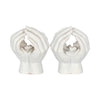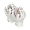 Cradled between two protective hands, a small child sleeps. Sheltered and kept from harm's way these pieces are the perfect symbol of parental care. Simply painted in white, this piece is cast in the finest resin and will add a protective aura to any room.